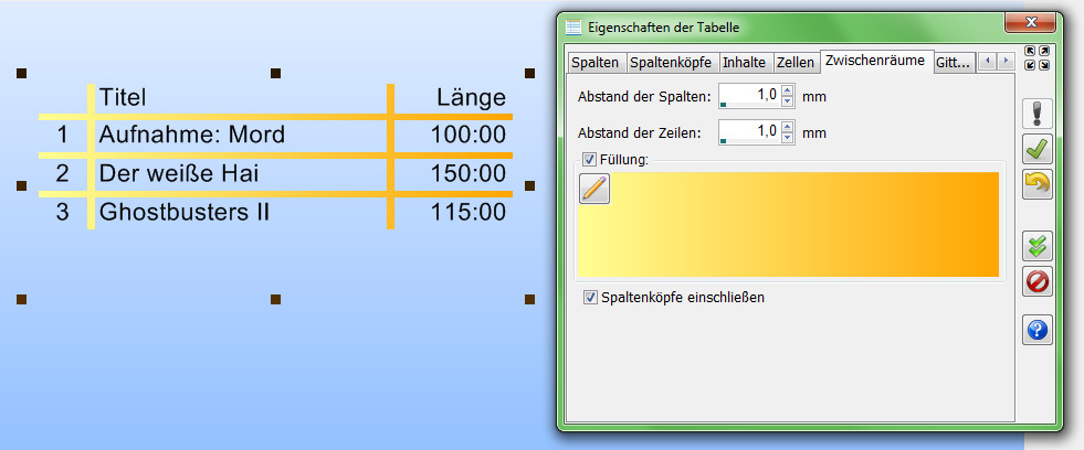 Die Tabelle kann optional auch Gitterlinien erhalten. Die Trennlinien werden auch ausgegeben, sofern keine Abstände zwischen den Spalten bzw. Zeilen gibt.