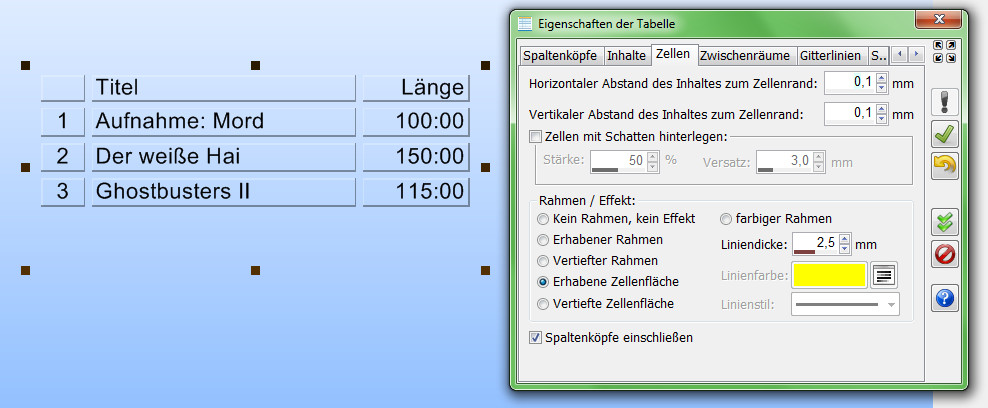 Ebenfalls ist es möglich, jede Zelle mit einem Schatten darzustellen.