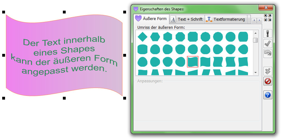 Bei einem Shape stehen stehen über 400 verschiedene Formen zur Auswahl. Neben einem Rahmen und einer Füllung, kann das Shape auch einen Text haben. Hier stehen eine Vielzahl von Schrifteffekte zur Auswahl. Als Besonderheit dieses Feldes kann der Text (wie links im Bild angezeigt) der äußeren Form angepasst werden.