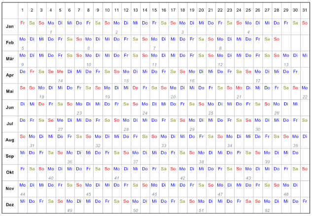 Monate vertikal, Wochentage gleich: