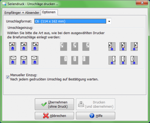 Damit Absender- und Empfänger-Adresse an den richtigen Positionen auf den Briefumschlägen ausgegeben werden, kann angegeben werden, wie der verwendete Drucker Briefumschläge einzieht und bedruckt.