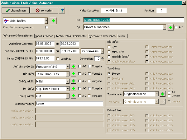 Zu jeder Aufnahme können eine Reihe von Informationen technischer Art angegeben werden, wie z.B. Aufnahmezeitraum, die Aufnahmelänge, Aufnahme-Gerät etc. Durch die Aufnahmelänge kann die noch verfügbare Kapazität einer Video-Kassette ermittelt werden, wobei eine Suchfunktion alle Kassetten-Nummern auflistet, die noch über eine gewünschte Mindestkapazität verfügen.