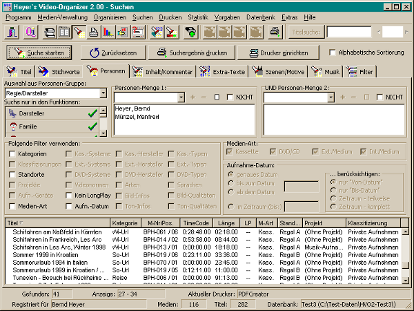 Es können mehrere Personen gesucht werden. Es werden alle Titel / Aufnahmen angezeigt bei denen mindestens eine der in Personen-Menge1 angegebenen Personen ("Heyer, Bernd" bzw. "Münzel, Manfred") gefunden wurde.